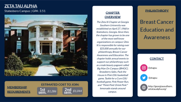 The Zeta Xi Chapter at Georgia Southern University was established on April 27, 1968 in Statesboro, Georgia. Since then, the chapter has grown to be one of the most well know organizations on campus! Zeta Xi is responsible for raising over $25,000 annually for our philanthropy, Breast Cancer Awareness and Education. The chapter holds annual events to support our philanthropy such as a male beauty pageant called Big Man On Campus (BMOC), Strawberry Sales, Pack the House in Pink GSU basketball game, Tackle for a Cure GSU football game, Pink Power Run, and "Think Pink! Drink Pink!" lemonade stands around campus.
