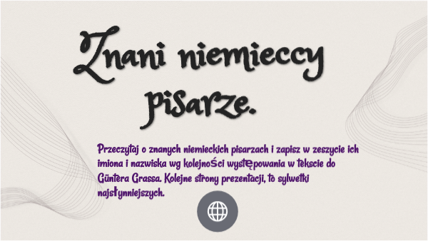 Przeczytaj o znanych niemieckich pisarzach i zapisz w zeszycie ich imiona i nazwiska wg kolejności występowania w tekscie do Güntera Grassa. Kolejne strony prezentacji, to sylwetki najsłynniejszych.