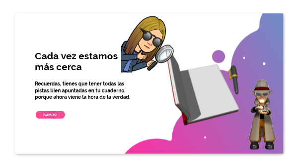 Recuerdas, tienes que tener todas las pistas bien apuntadas en tu cuaderno, porque ahora viene la hora de la verdad.