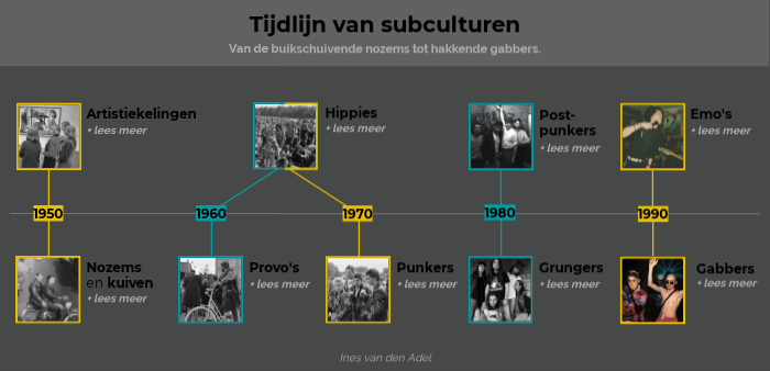 Bekende hippies:De hippiecultuur was de eerste subcultuur die zich over de hele wereld verspreidde, met een sterke eigen levensvisie. Gekleed in kleurrijke wijde broeken en jurken ging de protestgeneratie van naoorlogse kinderen los of psychedelische muziek, meestal onder invloed van drugs. Ze werden niet zoals hun ouders verslaafd aan alcohol, maar steken liever een joint op of slikken LSD.Ze zijn tegen het kapitalisme, tegen oorlog, en tegen de rollenverdeling tussen man en vrouw. Door hun haar te laten groeien willen genderverschil tegen te gaan. Je geen zorgen maken over carrière maken, want zin in een burgerlijk leven heb je toch niet. Turn on, tune in, drop out.