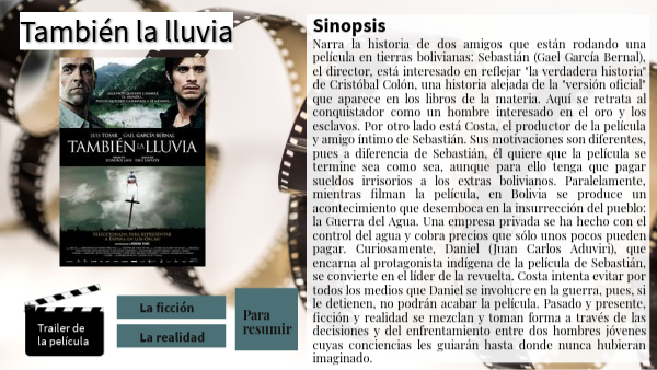Narra la historia de dos amigos que están rodando una película en tierras bolivianas: Sebastián (Gael García Bernal), el director, está interesado en reflejar "la verdadera historia" de Cristóbal Colón, una historia alejada de la "versión oficial" que aparece en los libros de la materia. Aquí se retrata al conquistador como un hombre interesado en el oro y los esclavos. Por otro lado está Costa, el productor de la película y amigo íntimo de Sebastián. Sus motivaciones son diferentes, pues a diferencia de Sebastián, él quiere que la película se termine sea como sea, aunque para ello tenga que pagar sueldos irrisorios a los extras bolivianos. Paralelamente, mientras filman la película, en Bolivia se produce un acontecimiento que desemboca en la insurrección del pueblo: la Guerra del Agua. Una empresa privada se ha hecho con el control del agua y cobra precios que sólo unos pocos pueden pagar. Curiosamente, Daniel (Juan Carlos Aduviri), que encarna al protagonista indígena de la película de Sebastián, se convierte en el líder de la revuelta. Costa intenta evitar por todos los medios que Daniel se involucre en la guerra, pues, si le detienen, no podrán acabar la película. Pasado y presente, ficción y realidad se mezclan y toman forma a través de las decisiones y del enfrentamiento entre dos hombres jóvenes cuyas conciencias les guiarán hasta donde nunca hubieran imaginado.