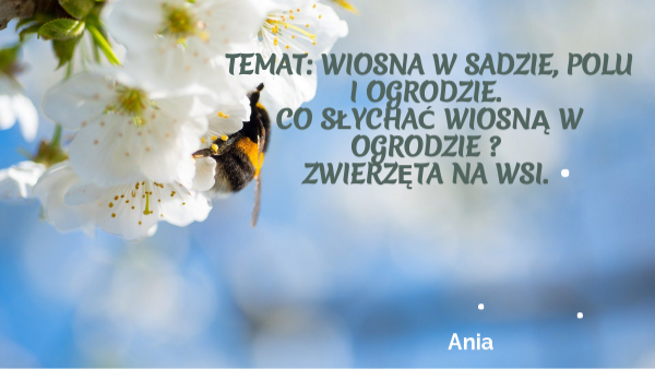 Temat: Wiosna w sadzie, polu i ogrodzie. Co słychać wiosną w ogrodzie ? Zwierzęta na wsi.