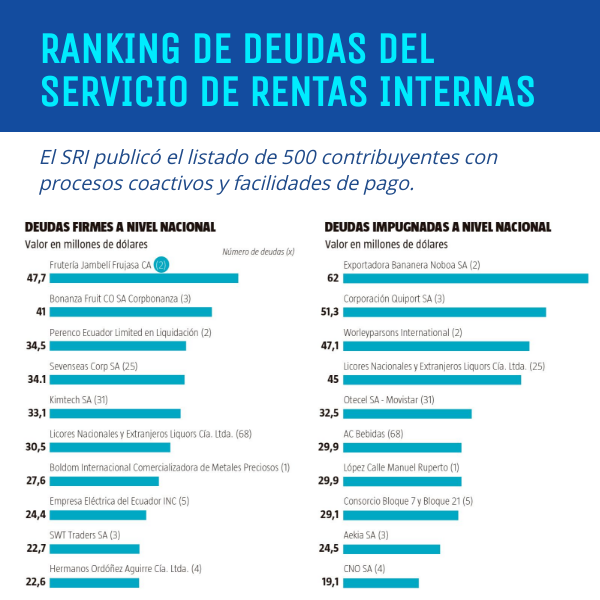 El SRI publicó el listado de 500 contribuyentes con procesos coactivos y facilidades de pago.