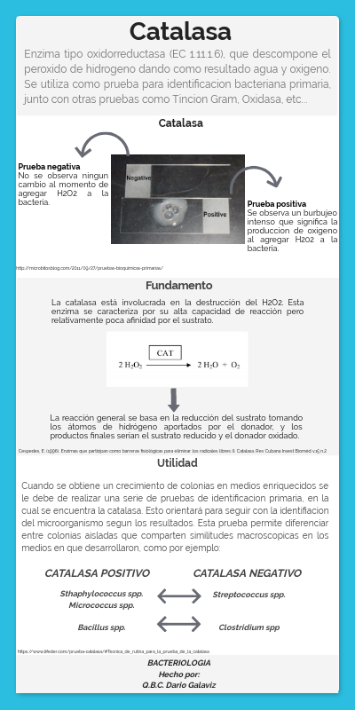 Enzima tipo oxidorreductasa (EC 1.11.1.6), que descompone el peroxido de hidrogeno dando como resultado agua y oxigeno. Se utiliza como prueba para identificacion bacteriana primaria, junto con otras pruebas como Tincion Gram, Oxidasa, etc...