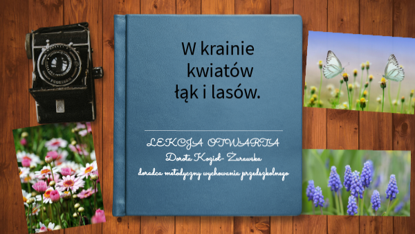 Scenariusz zajęć z zakresu edukacji przyrodniczej dla dzieci 5 i 6 letnich.Prowadzący : Dorota Kozioł- ŻurawskaTemat : W świecie kwiatów łąk i lasówCel główny : Budzenie przyjaznego stosunku do roślin i zwierząt poprzez kształtowanie właściwych postaw i zachowań. Zapoznanie z potrzebą bioróżnorodności. Cele szczegółowe : Dziecko- - rozumie potrzebę ochrony srodowiska - zna wybrane owady, gady, płazy, zwierzęta oraz ptaki zamieszkujące łąki - rozumie znaczenie łąk dla owadów zapylających - rozumie potrzebę bioróznorodności na łąkach -wypowiada sie na określony temat