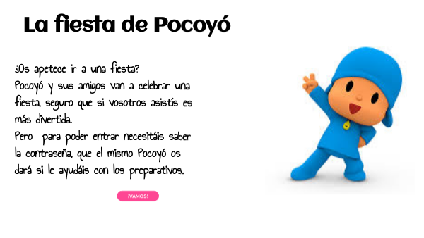 ¿Os apetece ir a una fiesta?Pocoyó y sus amigos van a celebrar una fiesta, seguro que si vosotros asistís es más divertida. Pero para poder entrar necesitáis saber la contraseña, que el mismo Pocoyó os dará si le ayudáis con los preparativos.