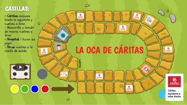 - Cáritas: avanzas hasta la siguiente y vuelves a tirar. - Mascarilla y lavado de manos: vuelves a tirar. - Hospital: 1 turno sin jugar. - Virus: vuelves a la casilla de salida.