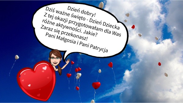 Dzień dobry! Dziś ważne święto - Dzień Dziecka Z tej okazji przygotowałam dla Was różne aktywności. Jakie? Zaraz się przekonasz! Pani Małgosia i Pani Patrycja