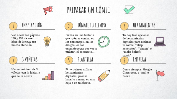 Piensa en una historia que quieras contar, en los personajes, en los diálgos, en las onomatopeyas que vas a utilizar, el escenario...
