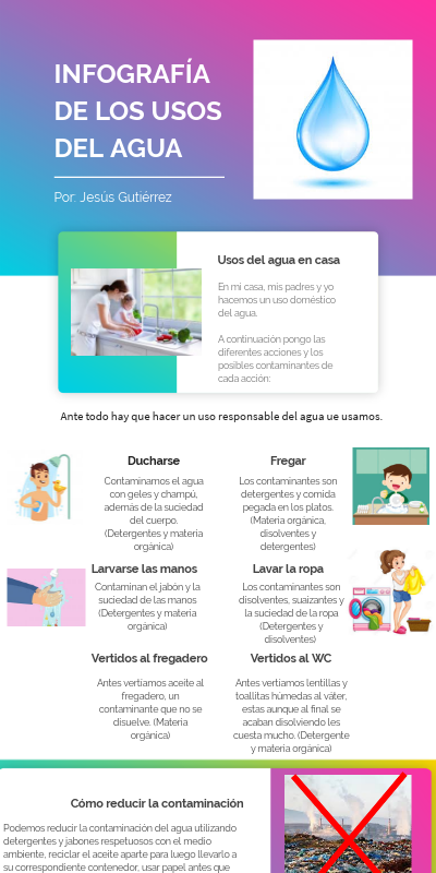 En mi casa, mis padres y yo hacemos un uso doméstico del agua. A continuación pongo las diferentes acciones y los posibles contaminantes de cada acción: