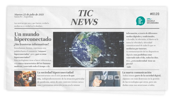 Si llegaste a este punto de este informativo, es porque has realizado el recorrido presentado en las páginas precedentes. Has leído, escuchado y visto los materiales que se presentan en cada una de las páginas de este períodico informativo.Y, como a esta altura te habrás dado cuenta de que va esto. Si, todo este camino trata sobre la temática de la "Hiperconectividad", ¿cómo nos afecta en nuestras vidas?, ¿qué posibilidades de desarrollo desde lo individual a lo colectivo presenta el hecho de vivir hiperconectados?, ¿qué peligros personales y sociales nos acechan en el hecho de "estar conectados