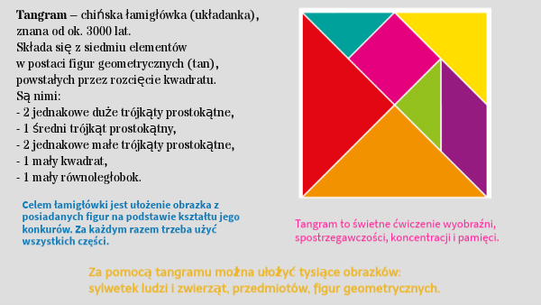 Tangram to świetne ćwiczenie wyobraźni, spostrzegawczości, koncentracji i pamięci.