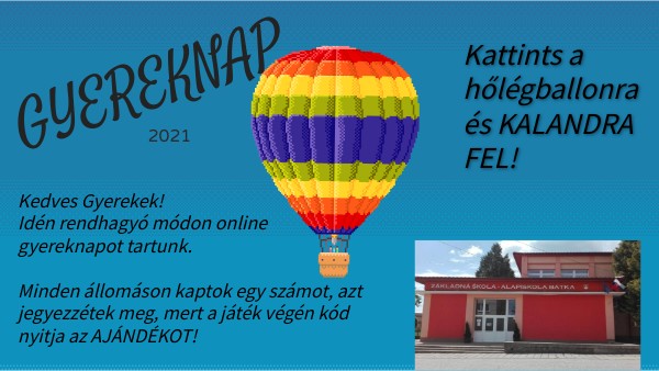Kedves Gyerekek!Idén rendhagyó módon online gyereknapot tartunk. Minden állomáson kaptok egy számot, azt jegyezzétek meg, mert a játék végén kód nyitja az AJÁNDÉKOT!