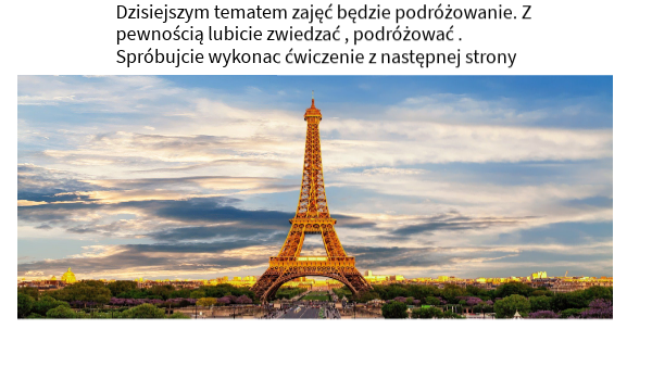 Dzisiejszym tematem zajęć będzie podróżowanie. Z pewnością lubicie zwiedzać , podróżować . Spróbujcie wykonac ćwiczenie z następnej strony