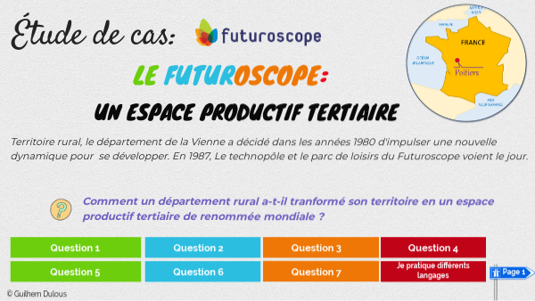 - Inspire-toi du modèle du Futuroscope, pour élaborer ta stratégie - Sois original et cherche des activités tertiaires susceptibles de s'implanter et/ou de se développer dans ton territoire - Structure ton exposé autour de trois parties (la localisation et les moyens pour accéder au territoire - les activités à créer, à développer et/ou à attirer - les actions à mener pour promouvoir le territoire) - L'exposé doit être ni trop court (pas moins de 5 mn) ni trop long (pas plus de 10mn) - Illustre ton exposé de documents iconographiques et graphiques pour le rendre plus dynamique et intéressant