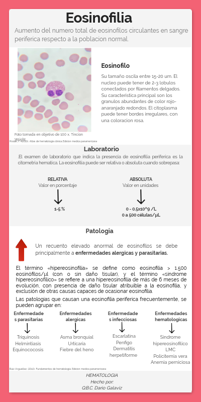 Su tamaño oscila entre 15-20 um. El nucleo puede tener de 2-3 lobulos conectados por filamentos delgados. Su caracteristica principal son los granulos abundantes de color rojo-anaranjado redondos. El citoplasma puede tener bordes irregulares, con una coloracion rosa.
