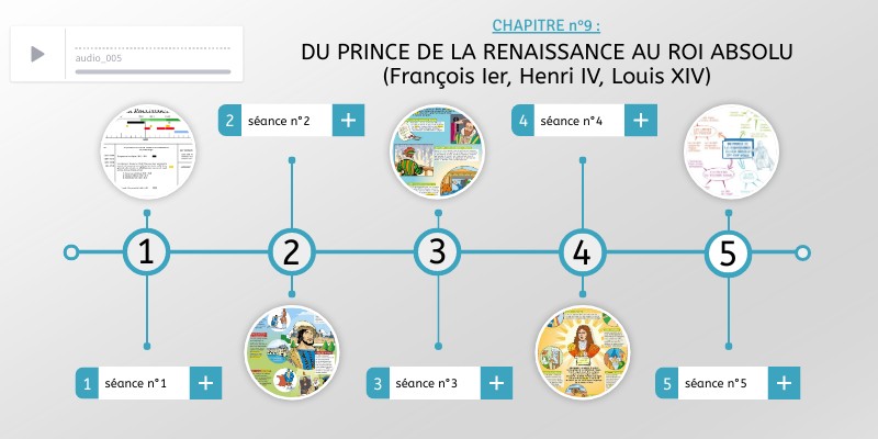 ÉTAPE n°1 : Dans le cahier, prendre une nouvelle page et écrire en rouge le titre du nouveau chapitre : Chapitre n°9 : Du prince de la Renaissance au roi absolu (François Ier, Henri IV, Louis XIV) ÉTAPE n°2 : Dans le cahier, sauter deux lignes et coller la frise chronologique. ÉTAPE n°3 : Compléter la frise chronologique en suivant le modèle ci-dessous. CONSIGNE : Cliquer sur l'image. => ÉTAPE n°4 : Dans le cahier, sauter une ligne et écrire la trace écrite en bleu. Cliquer sur l'icône "cahier" => ÉTAPE n°5 : Visionner la vidéo =>