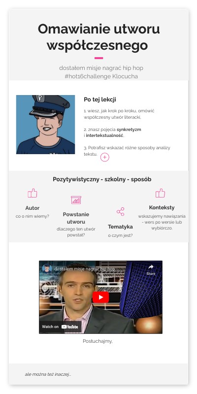 1. wiesz, jak krok po kroku, omówić współczesny utwór literacki, 2. znasz pojęcia synkretyzm i intertekstualność, 3. Potrafisz wskazać różne sposoby analizy tekstu.