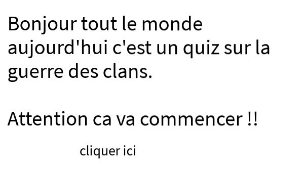 Bonjour tout le monde aujourd'hui c'est un quiz sur la guerre des clans. Attention ca va commencer !!