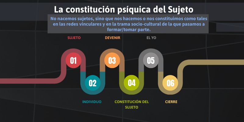 La constitución psíquica del sujeto tiene diversos factores que la atraviesan. No nacemos sujetos, llegamos a serlo a través de redes vinculares y tramas sociales. Somos sujetos en cuanto podemos ser activos y ser en sociedad con otros e intentar modificarla en algún modo. Implica mucho más que nacer, ser un individuo, tiene un desarrollo desde la vulnerabilidad propia de un recién nacido a la posibilidad empoderada de generar un cambio social. Es la palabra la posibilidad de constituirnos como sujetos internamente en nuestro reconocimiento individual, nuestra historia y singularidad que nos permite generar el rpropio relato; y es la palabra la posibilidad de vínculo con el otro y con esto el crecimiento y desarrollo personal y vincular. Una de las cuestiones a destacar respecto a la posibilidad de comprender estos procesos, tiene que ver con comprender que los atravesamientos de cada sujeto son únicos, que cada vez que nos encontramos con un usuario del sistema de salud, nos encontramos con toda una historia que influye en su aquí y ahora.