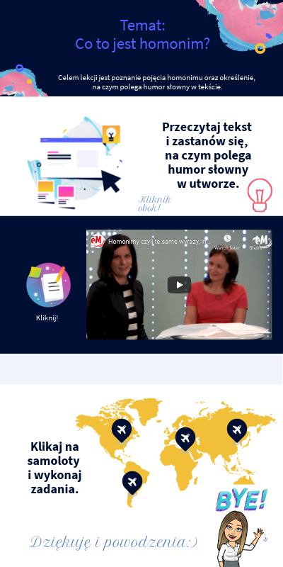 Celem lekcji jest poznanie pojęcia homonimu oraz określenie, na czym polega humor słowny w tekście.