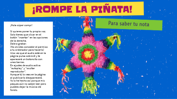 ¡Hola súper compi! Si quieres poner tu propia voz. Solo tienes que clicar en el botón "insertar" en las opciones de la derecha. Dale a grabar. (No olvides conceder el permiso a tu ordenador para hacerlo) Una vez que el audio está en la página pulsa sobre él y te aparecerá un botoncito con unas barras. En ajustes de audio activa "autoplay" y "ocultar reproductor". Aunque tú lo veas en la página al publicarlo desaparecerá. Yo lo he hecho así porque mis peques aún no saben leer pero puedes dejar la música de fondo.