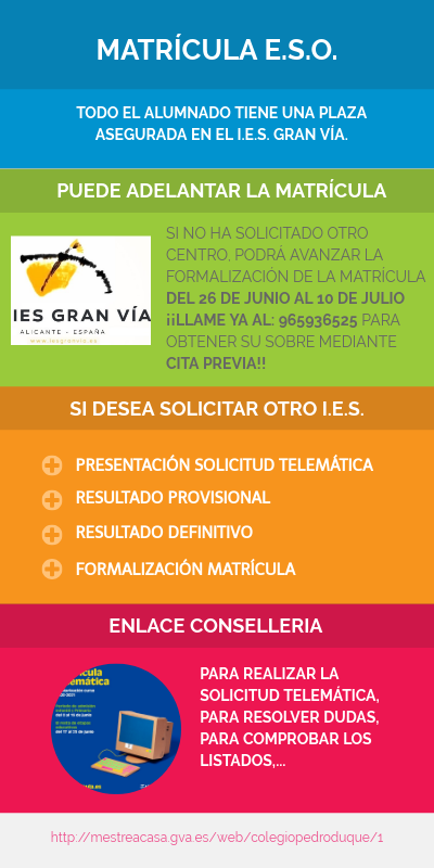SI NO HA SOLICITADO OTRO CENTRO, PODRÁ AVANZAR LA FORMALIZACIÓN DE LA MATRÍCULA DEL 26 DE JUNIO AL 10 DE JULIO ¡¡LLAME YA AL: 965936525 PARA OBTENER SU SOBRE MEDIANTE CITA PREVIA!!