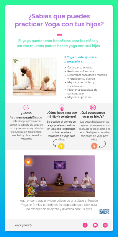 Aquí encontrarás un video guiado de una clase entera de Yoga en familia, cuendo estés preparado dale click para una experiencia relajante y divertida con tus hijos.