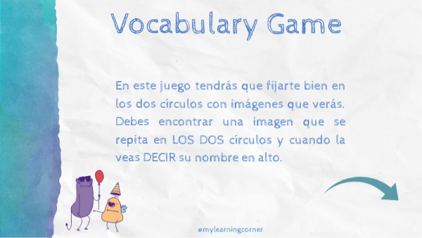 En este juego tendrás que fijarte bien en los dos círculos con imágenes que verás. Debes encontrar una imagen que se repita en LOS DOS círculos y cuando la veas DECIR su nombre en alto.