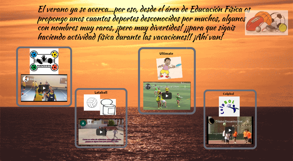 El verano ya se acerca...por eso, desde el área de Educación Física os propongo unos cuantos deportes desconocidos por muchos, algunos con nombres muy raros, ¡pero muy divertidos! ¡¡para que sigais haciendo actividad física durante las vacaciones!! ¡Ahí van!