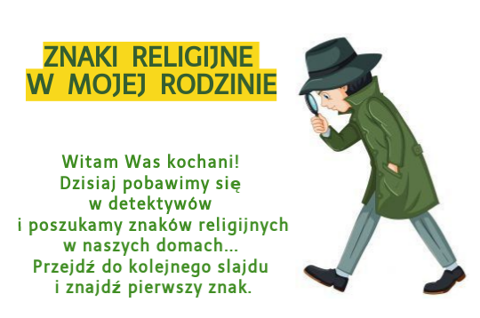 Witam Was kochani! Dzisiaj pobawimy się w detektywów i poszukamy znaków religijnych w naszych domach... Przejdź do kolejnego slajdu i znajdź pierwszy znak.