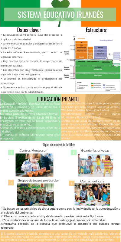 El Sistema Edcativo Irlandés pertenece a una categoría de modelo más asistencial donde el Estado solo interviene en situaciones de desprotección, riesgo social o discapacidad , ya que se considera que la atención a los menores (0-3 años) es responsabilidad de las familias.
