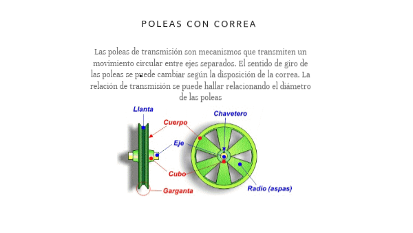 Las poleas de transmisión son mecanismos que transmiten un movimiento circular entre ejes separados. El sentido de giro de las poleas se puede cambiar según la disposición de la correa. La relación de transmisión se puede hallar relacionando el diámetro de las poleas