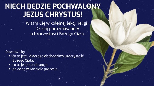 Witam Cię w kolejnej lekcji religii. Dzisiaj porozmawiamy o Uroczystości Bożego Ciała.