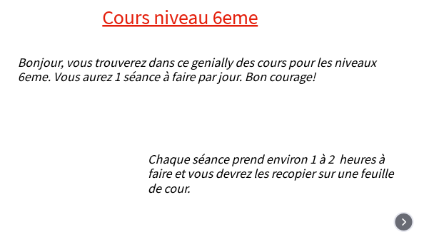 Bonjour, vous trouverez dans ce genially des cours pour les niveaux 6eme. Vous aurez 1 séance à faire par jour. Bon courage!