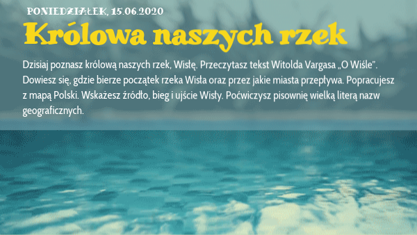 Dzisiaj poznasz królową naszych rzek, Wisłę. Przeczytasz tekst Witolda Vargasa „O Wiśle”. Dowiesz się, gdzie bierze początek rzeka Wisła oraz przez jakie miasta przepływa. Popracujesz z mapą Polski. Wskażesz źródło, bieg i ujście Wisły. Poćwiczysz pisownię wielką literą nazw geograficznych.