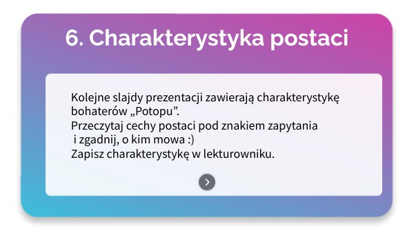 Kolejne slajdy prezentacji zawierają charakterystykę bohaterów „Potopu”. Przeczytaj cechy postaci pod znakiem zapytania i zgadnij, o kim mowa :) Zapisz charakterystykę w lekturowniku.