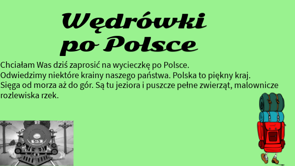 Chciałam Was dziś zaprosić na wycieczkę po Polsce. Odwiedzimy niektóre krainy naszego państwa. Polska to piękny kraj. Sięga od morza aż do gór. Są tu jeziora i puszcze pełne zwierząt, malownicze rozlewiska rzek.