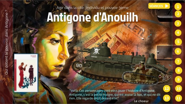 Eléments de programme : Agir dans la cité : individu et pouvoir Rédiger, en réponse à une consigne d’écriture, un écrit d’invention s’inscrivant dans un genre littéraire du programme, en s’assurant de sa cohérence et en respectant les principales normes de la langue écrite.Objectifs : - Lire et analyser des images fixes et mobiles.- Lire intégralement une pièce de théâtre tragique.- Découvrir un symbole de résistance face au pouvoir.- S'interroger sur la résonance d’un mythe antique au XXe siècle.- Développer le vocabulaire du pouvoir, de la politique et de la résistance.Langue : La phrase simple/complexe (révisions) Focus sur La proposition subordonnée relative La concession ou l'opposition