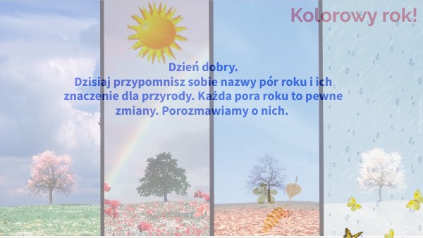 Dzień dobry. Dzisiaj przypomnisz sobie nazwy pór roku i ich znaczenie dla przyrody. Każda pora roku to pewne zmiany. Porozmawiamy o nich.