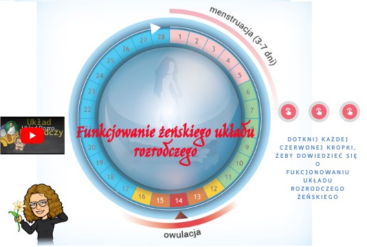 Dotknij każdej czerwonej kropki, żeby dowiedzieć się o fukcjonowaniu układu rozrodczego żeńskiego