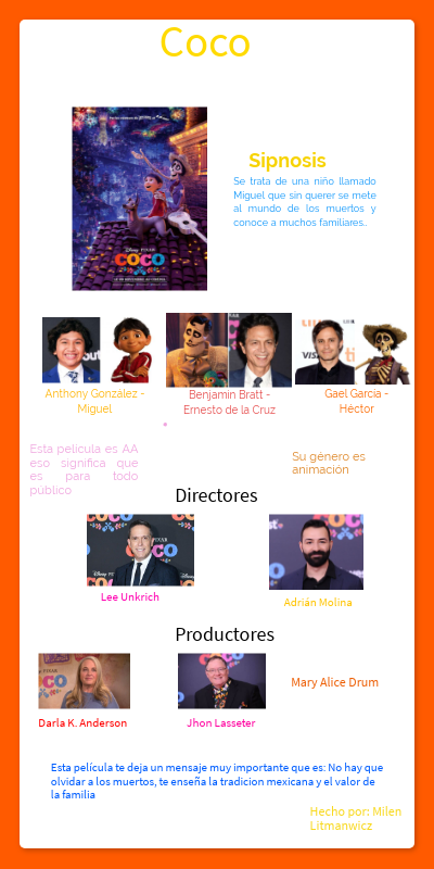 Se trata de una niño llamado Miguel que sin querer se mete al mundo de los muertos y conoce a muchos familiares..