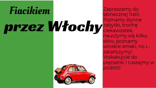Zapraszamy do słonecznej Italii. Poznamy słynne zabytki, trochę ciekawostek, nauczymy się kilku słów, poznamy włoskie smaki, no i... zatańczymy! Wskakujcie do pięćsetki i ruszajmy w podróż!
