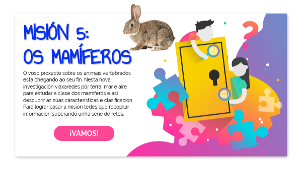 O voso proxecto sobre os animais vertebrados está chegando ao seu fin. Nesta nova investigación viaxaredes por terra, mar e aire para estudar a clase dos mamíferos e así descubrir as súas características e clasificación.Para lograr pasar a misión tedes que recopilar información superando unha serie de retos.