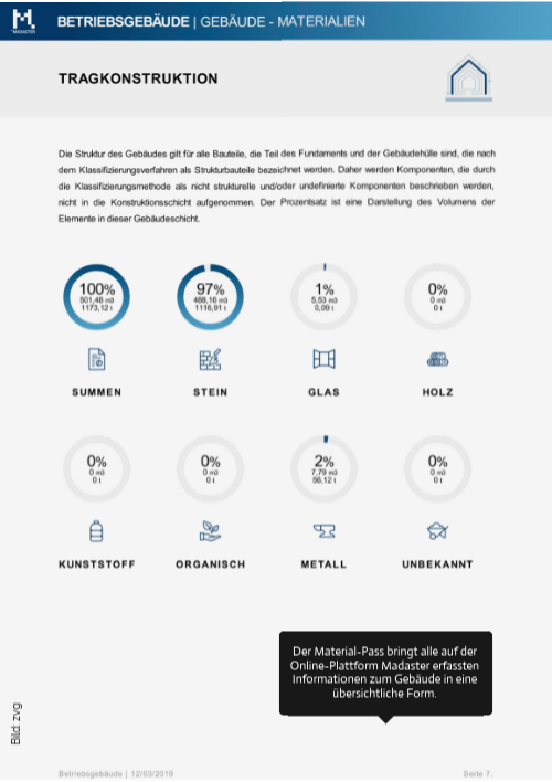 Der Material-Pass bringt alle auf der Online-Plattform Madaster erfassten Informationen zum Gebäude in eine übersichtliche Form.