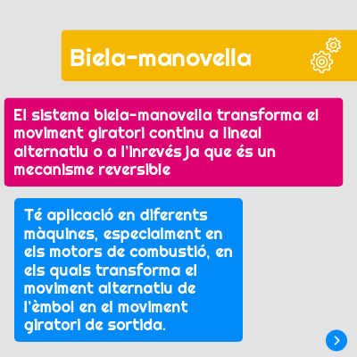 El sistema biela-manovella transforma el moviment giratori continu a lineal alternatiu o a l’inrevés ja que és un mecanisme reversible