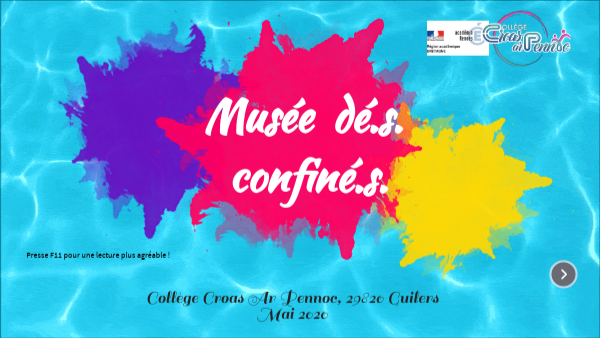 L'idée de ce musée en ligne est venue le 12 mai après le début du "déconfinement" en France en 2020. Quelles traces garder de cette période extraordinaire dont nous sortions ? Comment évoquer ce long moment avec nos élèves ? Comment en faire mémoire ? Comment revenir au collège ? Impossible de faire comme si rien ne s'était passé ! Voici dans ce musée ce que les professeurs et les élèves de Croas Ar Pennoc ont vécu, écrit, dessiné, photographié au fil des semaines pendant et après. La bande son est constituée de musiques jouées par des élèves : harpe, piano, flûte traversière, batterie, saxophone. Bravo ! C'est parti pour une plongée au coeur du confinement des habitants de Croas Ar Pennoc ! MERCI aux nombreux élèves et collègues pour leurs contributions variées et originales. Martine Fourn Professeure d'histoire, géographie et enseignement moral et civique