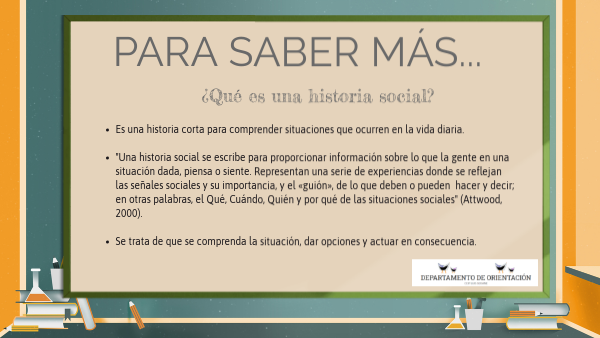 - "Una historia social se escribe para proporcionar información sobre lo que la gente en una situación dada, piensa o siente. Representan una serie de experiencias donde se reflejan las señales sociales y su importancia, y el «guión», de lo que deben o pueden hacer y decir; en otras palabras, el Qué, Cuándo, Quién y por qué de las situaciones sociales" (Attwood, 2000).