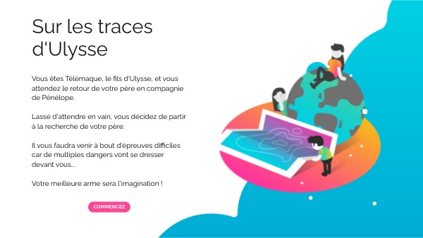 Vous êtes Télémaque, le fils d'Ulysse, et vous attendez le retour de votre père en compagnie de Pénélope. Lassé d'attendre en vain, vous décidez de partir à la recherche de votre père. Il vous faudra venir à bout d'épreuves difficiles car de multiples dangers vont se dresser devant vous... Votre meilleure arme sera l'imagination !