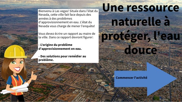 Bienvenu à Las vegas! Située dans l'état du Nevada, cette ville fait face depuis des années à des problèmes d'approvisionnement en eau. L'état du Nevada vous charge de mener l'enquète! Vous devez écrire un rapport au maire de la ville. Dans ce rapport devront figurer: - L'origine du problème d'approvisionnement en eau. - Des solutions pour remédier au problème.